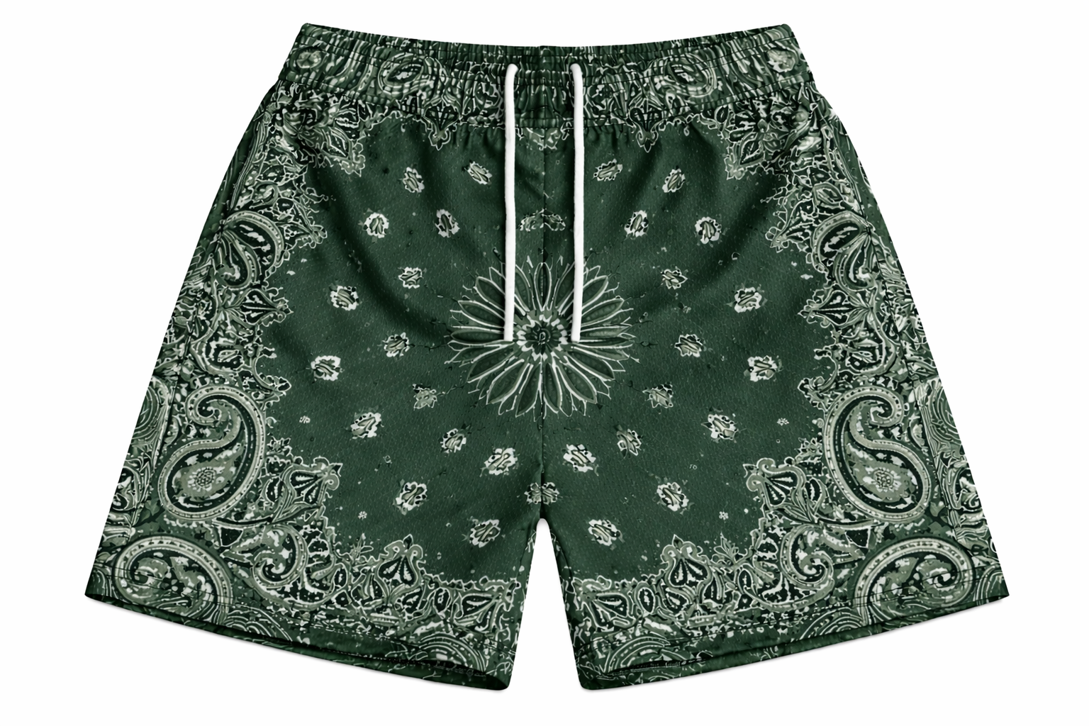 ASYLUM CO. FOREST GREEN PAISLEY BANDANA SATIN MESH SHORTS