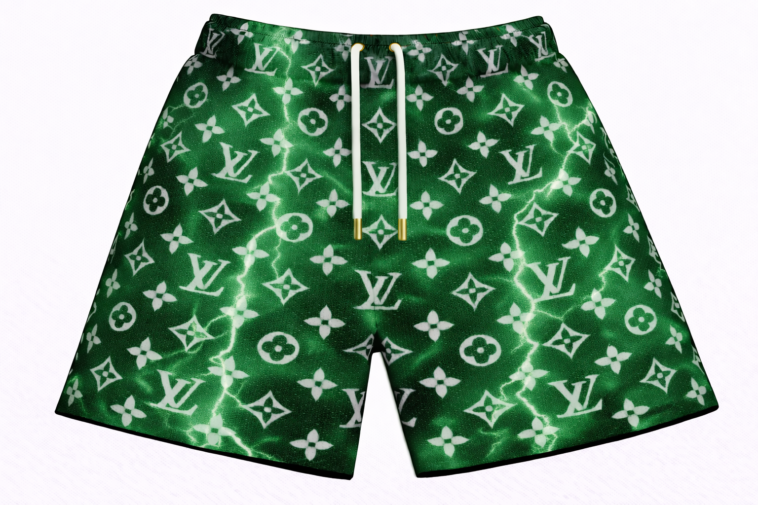 ASYLUM CO. LV MONOGRAM GREEN STORM SATIN MESH SHORTS