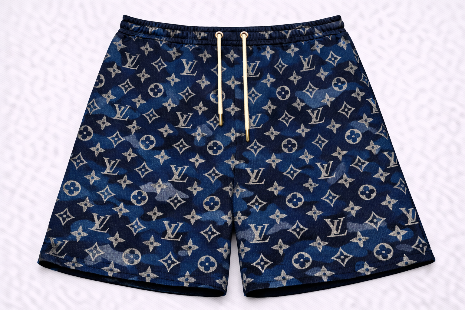 ASYLUM CO. MONOGRAM BLUE BAPE CAMO SATIN MESH SHORTS