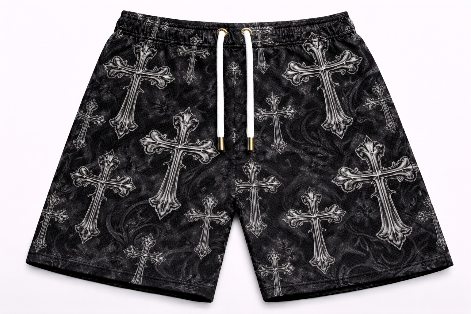 ASYLUM CO. BLACK/GREY MULTI-CROSS MONOGRAM SATIN MESH SHORTS