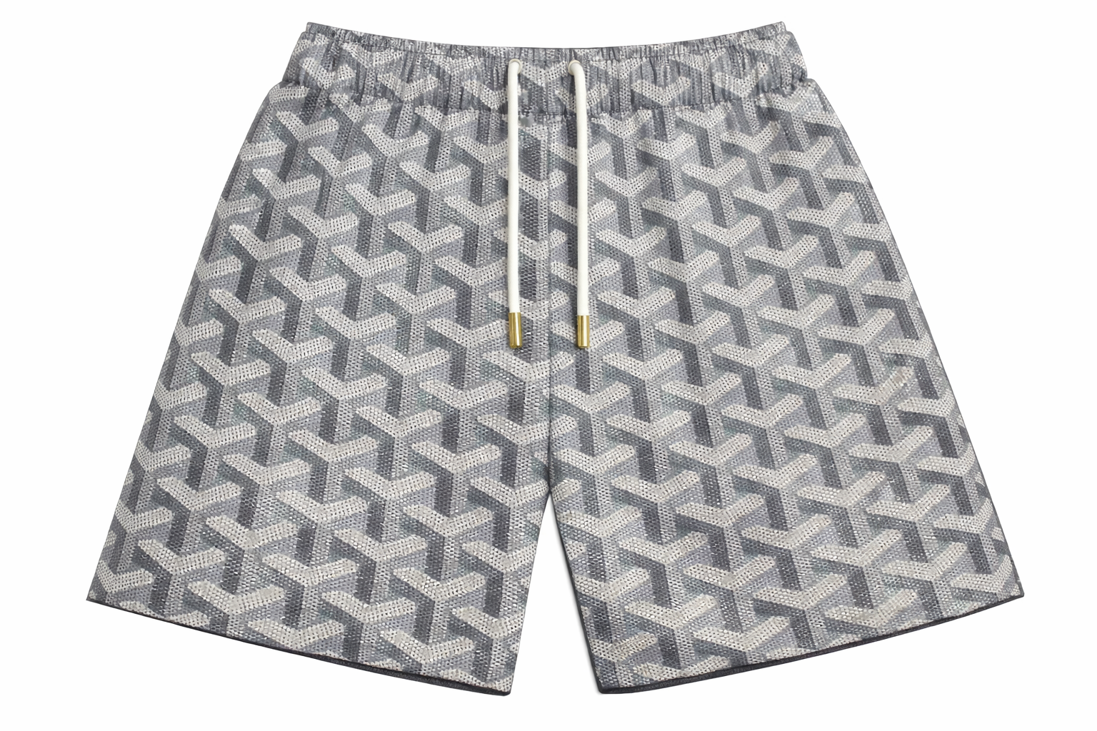 ASYLUM CO. SILVER GOYARD MONOGRAM SATIN MESH SHORTS